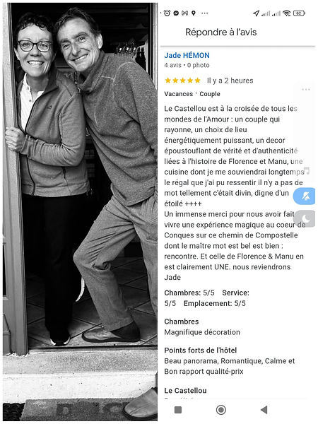 We stayed at Le Castellou this week for 2 nights after finishing our Walk from Le Puy en Velay. The walk was difficult with high temperatures but we found an oasis at the Castellou. Such great food and the town of Conques is magical. Manu and Flo made us feel like royals and we would recommend this establishment to anyone travelling the Camino!! Thank you Manu and Flo. Such wonderful memories!